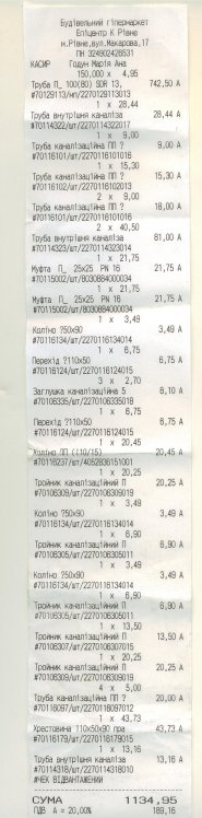 Дріт електричний 130м (4х16) – 1586грн + 16грн (1% за оплату) + 140грн доставка з Києва Новою поштою. Всього: 1742грн (За дріт я розповідав – вхідний дріт до будинку Василя було пошкоджено, пішов дощ і дріт замкнуло, автомат вчасно не спрацював, в результаті старий дріт практично сплавився). Довелося терміново  закупити новий, щоб відновити електропостачання..)