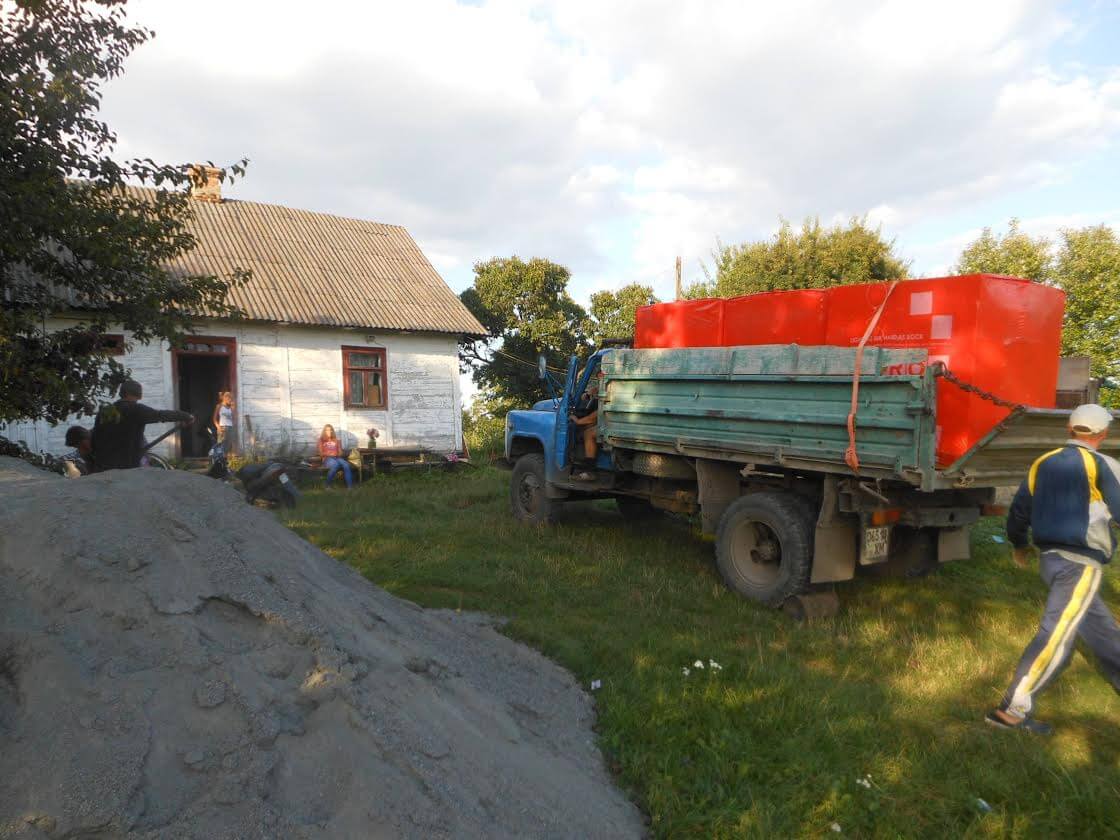 Отже, завезення матеріалу планомірно відбувається. Уже завезли до Василя пісок, відсів, блоки на зігнившу стіну, клей для блоків. Уже домовлено, що завеземо вогнетривку цеглу на грубу, також потрібно багато цементу на заливку підлоги.
